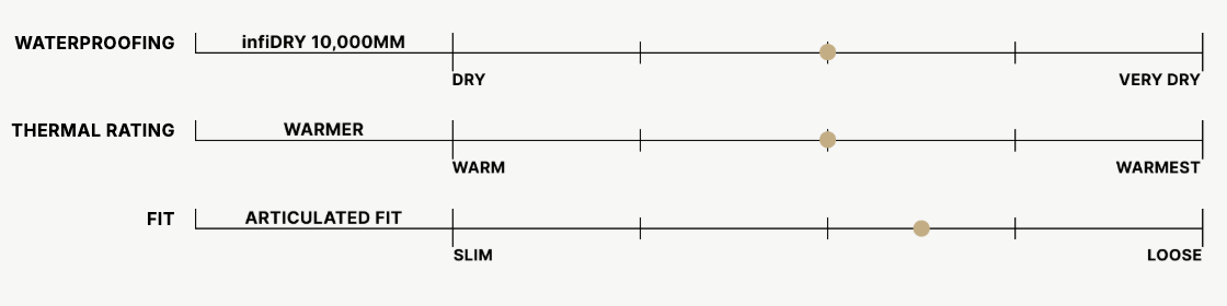 10000mm Waterproofing, 10000gm Breathability – Advanced all-round waterproofing during any winter conditions.