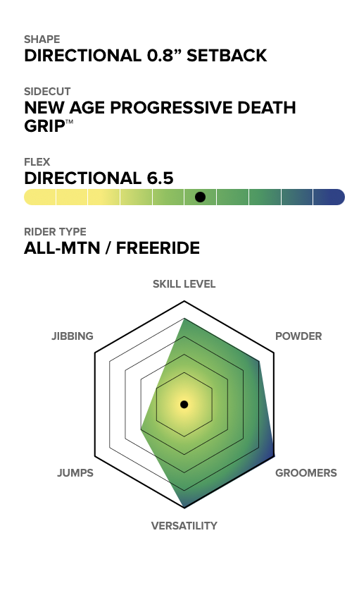 The ALPINE V1 Profile design features mid-body camber with a flat tail and a reverse cambered nose. This allows for tons of pop and stability on hard pack while increasing float and landing power, improving the rider’s performance in deep snow. The camber runs longer in the tail—providing extra power for the ascent or for larger riders drawn to a dedicated wide series.
