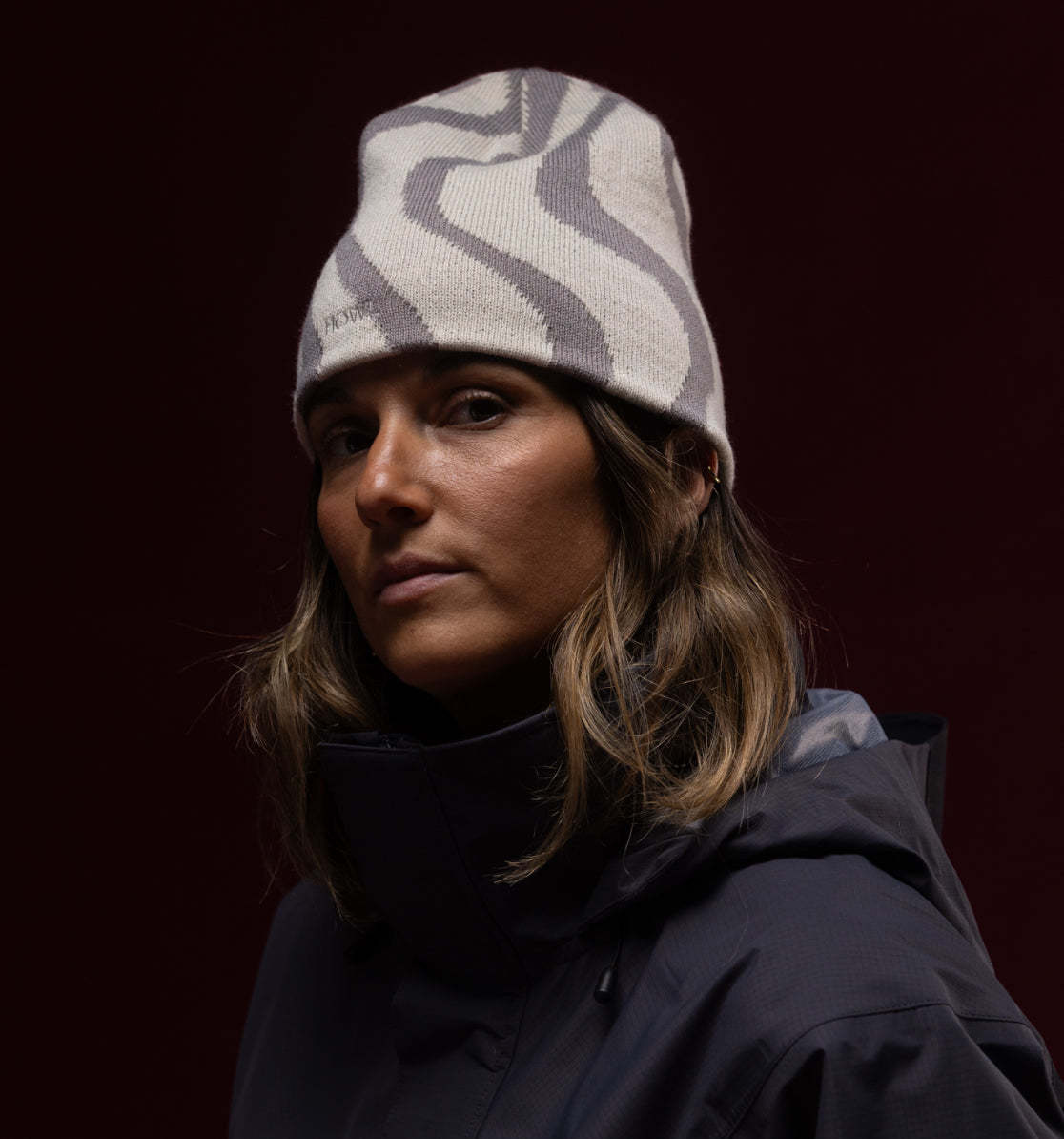 Acrylic flat knit with two color graphic jacquard with no cuff, seamless construction.