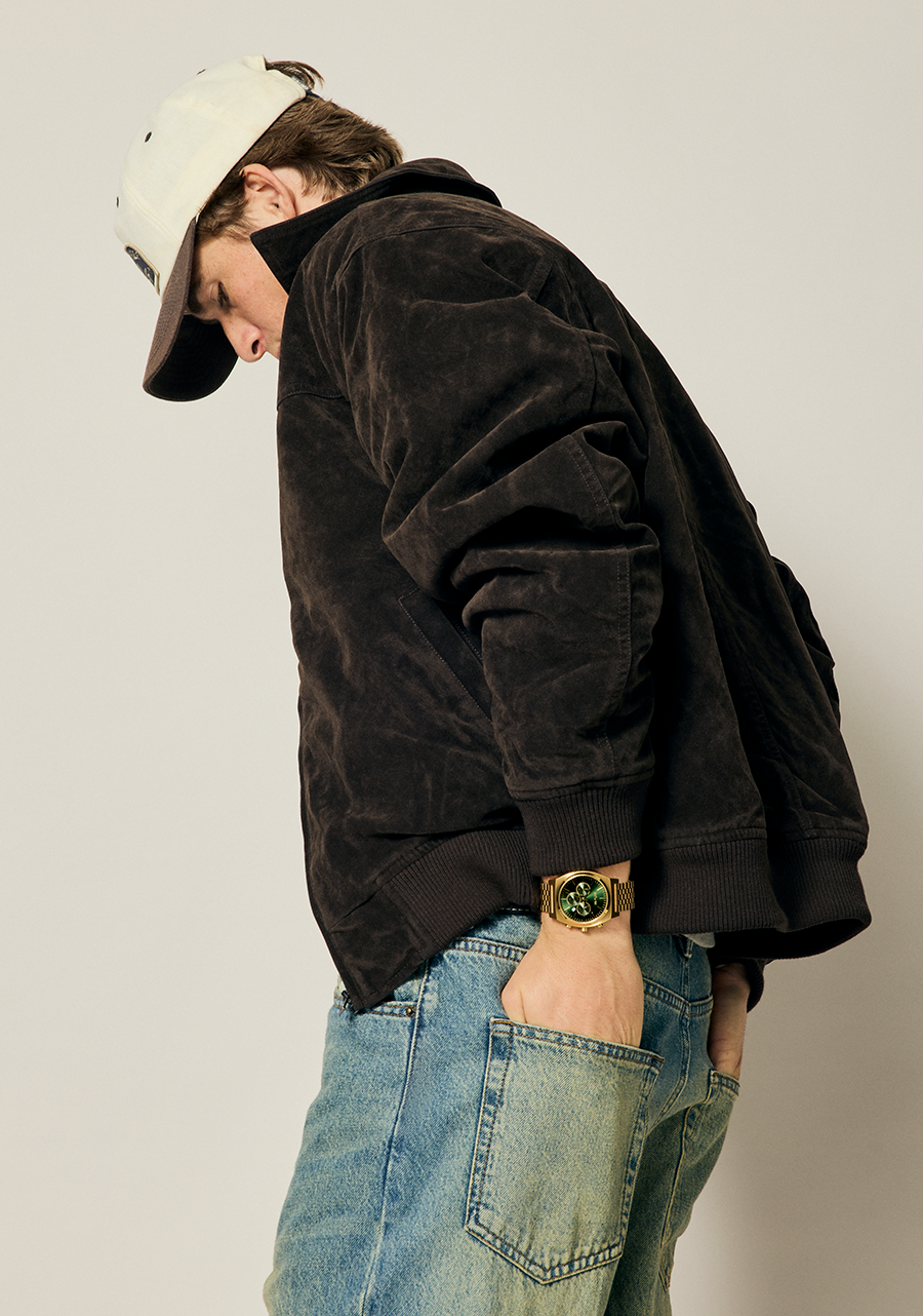 40mm custom solid stainless steel case and fixed bezel with a 100 meter / 10 ATM water rating. Comes with a hardened mineral crystal, triple gasket stainless steel crown, stainless steel screw down caseback and spring pin lugs.