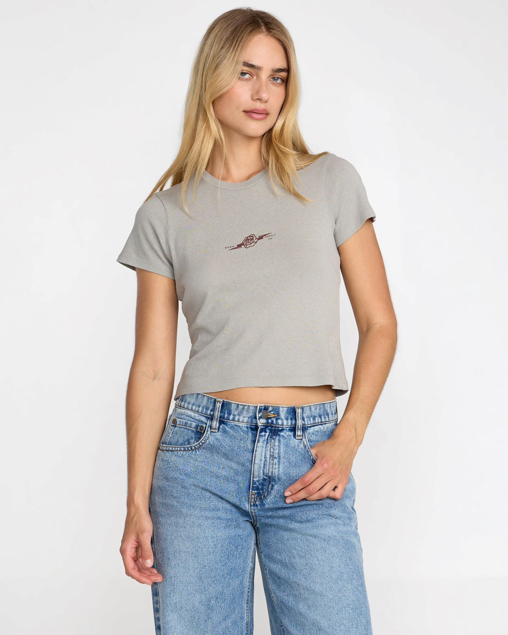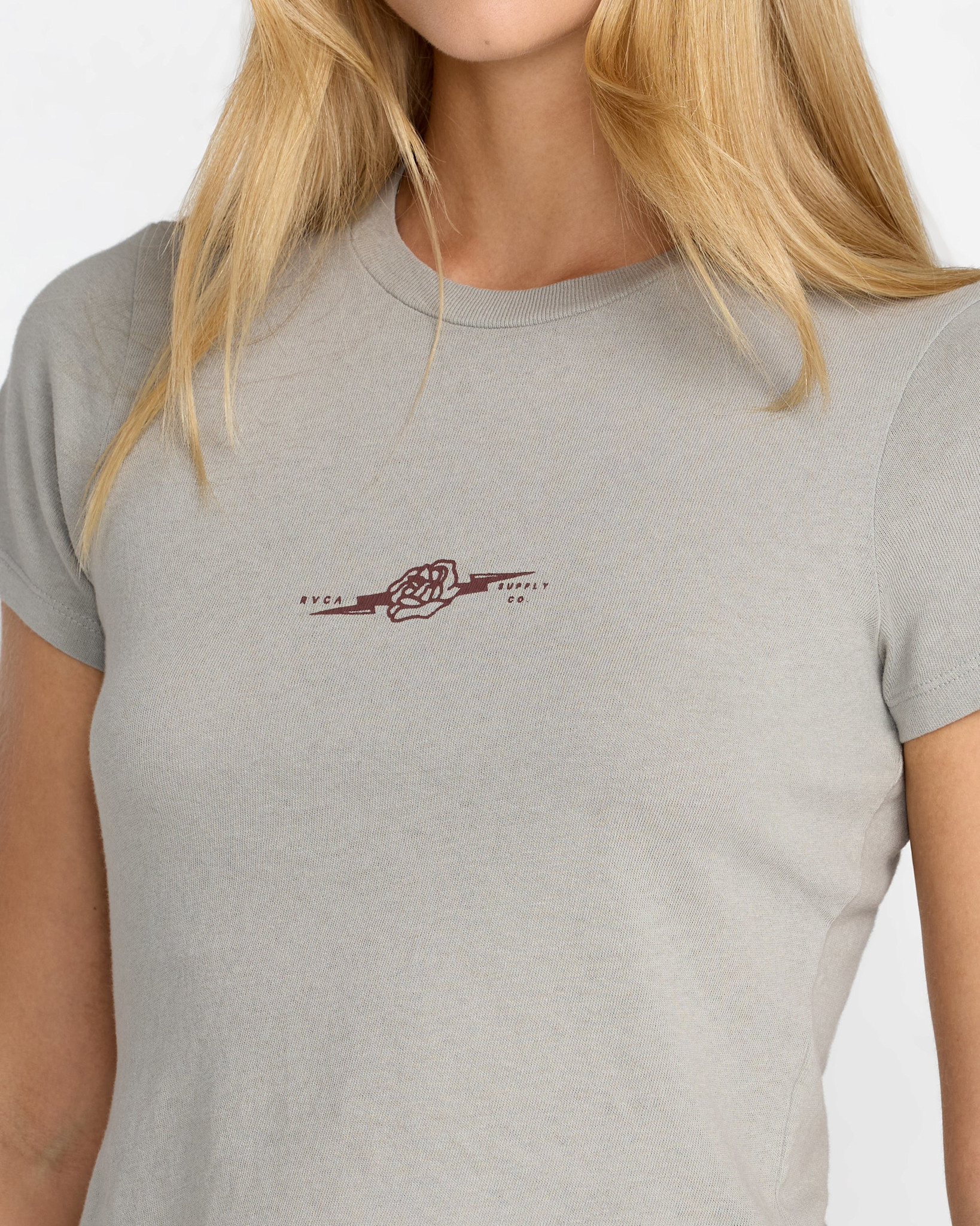 • This women’s slim fit baby tee merges soft 100% cotton with RVCA’s signature blend of surf-inspired flair and urban attitude.